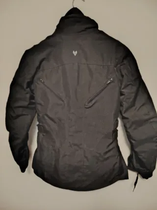 Giubbino da moto da donna, taglia S. Presenta dettagli a bande rosse e bianche sulle maniche e sul petto. - Zip frontale. - Collo alto con chiusura a bottone. - Tasche laterali con zip. - Polsini regolabili con zip e velcro. - Protezioni nella schiena, sulle spalle e nei gomiti - Usato solo due volte