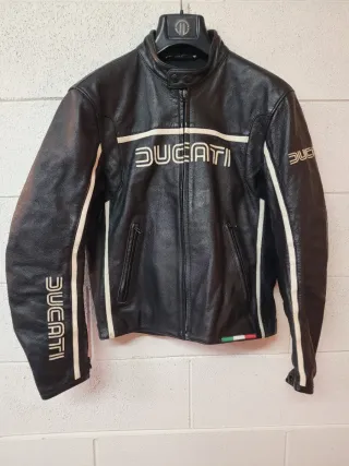 Giacca da moto Ducati taglia L in tessuto misto pelle, con protezioni su spalle e gomiti, fodera termica interna rimovibile. Nessun segno di caduta, leggermente usurato in alcuni punti come da foto. Larghezza spalle 43 cm, fianchi 53 cm, lunghezza 61 cm, manica 58 cm.