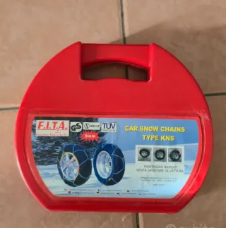Catene da neve a montaggio rapido F.I.T.A. modello KNS-40 Omologate (TÜV / GS / V5117) Incluse istruzioni originali e maglie di ricambio Gruppo 40 Compatibili con le seguenti misure di pneumatici: R13: 155x13, 165/70x13, 175/65x13, 185/60x13, 195/55x13 R14: 145x14, 165/60x14, 165/65x14, 175/60x14 R15: 135x15 Mai usate