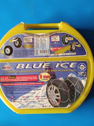 Catene da neve marca Blue Ice, modello 9mm. - Maglia a rombo. - Montaggio facile e veloce. - Nuovi anelli per ingombro ridotto. - Ideali per auto con ABS e pneumatici larghi. - Catena a cavo flessibile ricoperta con guaina colorata. - Incluse guanti e maglie di riparazione.