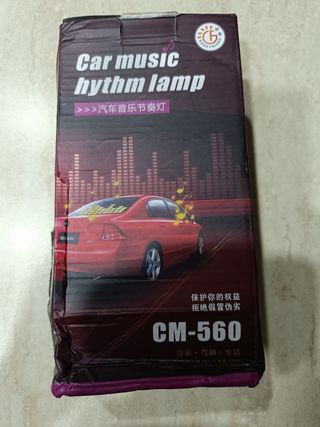 Lampada LED per auto che si sincronizza con il ritmo della musica. - Modello CM-560. - Design con auto rossa e grafiche musicali. - Testo in cinese e inglese sulla confezione.