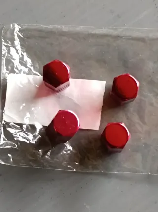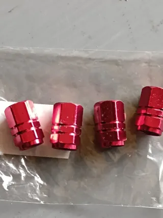 Set di 4 tappi per valvole delle ruote. - Colore: rosso metallizzato. - Materiale: alluminio.