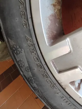 4 Cerchi in lega Ford originale da 17" con gomma invernale 205/55 R17. Pneumatico Ford Stone invernale con marchio fiocchi di neve (M+S), disegno aggressivo per neve e ghiaccio. Cerchio in lega argento a 5 razze con logo Ford centrale, usato ma in buone condizioni strutturali. Gomma con buon battistrada residuo, ideale per Ford Focus/Mondeo o compatibili