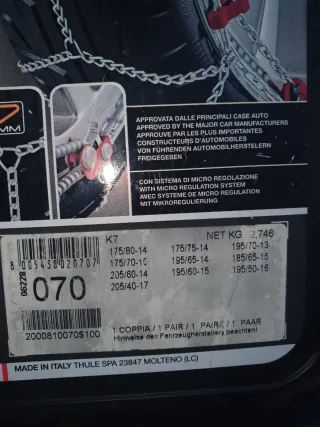 PREZZO MINIMO NON TRATTABILE Catene auto da neve come nuove 9 mm Emi Sports KNS50 rapide facili 8056046082212 RIF 6008221 - 160/80R13 - 160R13 - 165/80R13 - 165R13 e molte altre compatibili come da tagliando laterale fotografato CERTIFICAZIONE TUV AUSTRIA GS prodotto d'alta qualità Set di catene da neve per auto, complete di istruzioni. - Catene in metallo. - Cavi di montaggio in gomma blu. - Cavi di tensione gialli. - Custodia in plastica nera.