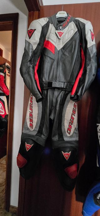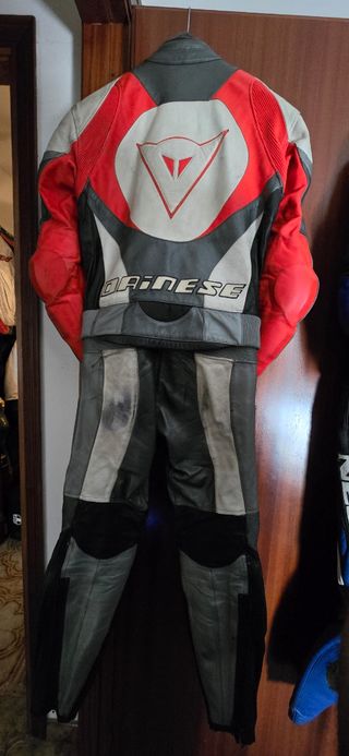 Tuta da moto Dainese in pelle, divisibile in due pezzi. Buone condizioni, qualche leggero segno di usura, no buchi, cerniere ottime e velcri in ottimo stato - Materiale: Pelle - Colore: Nero, rosso e bianco - Marca: Dainese - Taglia 50