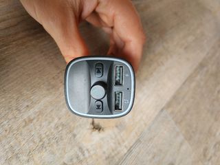 Adattatore per auto per trasmettere radio o collegarsi al Bluetooth del telefono. Presenti due ingressi USB e un tasto per rispondere alle chiamate