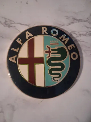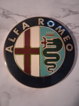 Stemma originale Alfa Romeo, un simbolo iconico. - Design circolare con bordo scuro. - Raffigurazione della croce di San Giorgio e del Biscione. Prodotto usato come da foto.