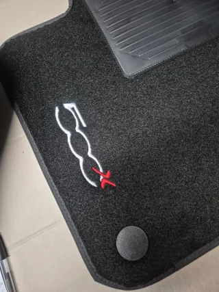 Set di tappetini per Fiat 500X. Con 2 fix lato guida e cucitura logo 500x - Tappetini in moquette nera. - Logo 500 ricamato in bianco e rosso su uno dei tappetini anteriori. - Inserti in gomma su alcuni tappetini per una maggiore protezione. - Finitura con bordo grigio.