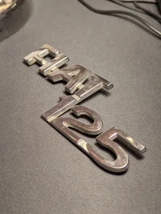 Stemma metallico originale per FIAT 125. Originale d'epoca. - Scritta FIAT e 125 in rilievo. - Finitura cromata lucida. - Design vintage.