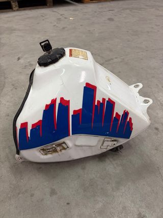 Serbatoio per Suzuki DR 650 con grafica. - Serbatoio bianco con grafica blu e rossa. - Tappo serbatoio incluso.