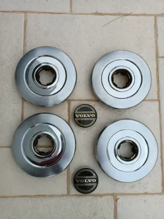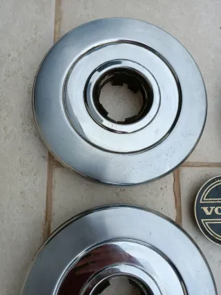 Set 4 borchie ruota con due fregi centrali per Volvo 240 anni 70 d'epoca, borchie in ottime condizioni, fregi centrali con qualche segno d'uso. Il prezzo è riferito a tutto ciò che vedete in foto
