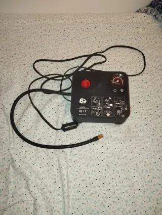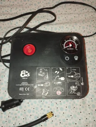 Compressore portatile per auto Fix & Go Airflat, ideale per gonfiare pneumatici. - Funzionamento a 12V. - Manometro integrato per il controllo della pressione. - Cavo di alimentazione con spina accendisigari. - Tubo flessibile con attacco per valvola.