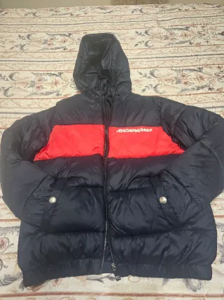Giubbotto imbottito Richmond con cappuccio. Presenta una banda rossa sul petto con logo. - Colore blu navy e rosso. - Logo Richmond bianco sul petto. - Chiusura con zip. - Due tasche laterali con bottoni.