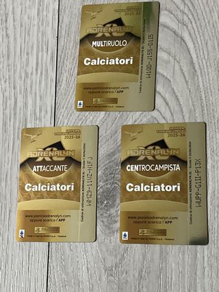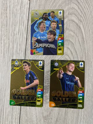 Set di carte Adrenalyn XL Serie A stagione 2024-2025. - Carta CAMPIONI Napoli. - Carta GOLDEN BALLER De Ketelaere. - Carta GOLDEN BALLER Barella. Vendibili anche singolarmente
