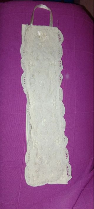Portarotolo in tessuto con due spazi, ideale per organizzare. - Design elegante con finiture in pizzo. - Colore beige e bianco.