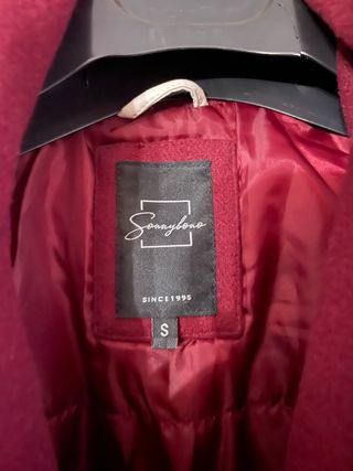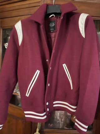 Bomber bordeaux con dettagli bianchi, taglia S. - Maniche in ecopelle bianca. - Polsini e fondo a costine con strisce bianche. - Tasche laterali con bordatura bianca. - Chiusura con bottoni a pressione bianchi.