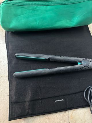Piastra lisciante GHD di colore verde, completa di custodia termoresistente. - Custodia in tessuto resistente al calore. - Design ergonomico.