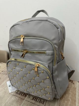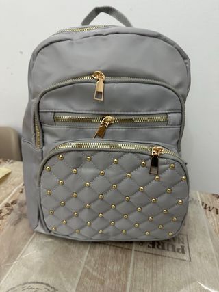 Zaino da donna dal design moderno e curato. Nuovo - Colore grigio. - Dettagli con borchie dorate. - Tasca frontale trapuntata con zip. - Zip dorate. - Materiale resistente.