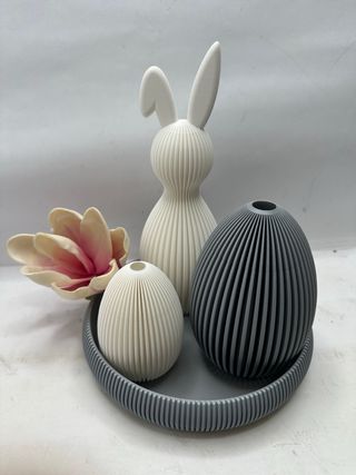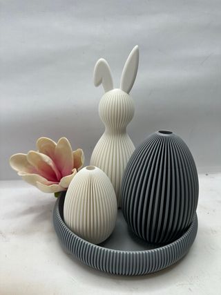 Set decorativo per la tavola a tema pasquale, composto da un coniglio e due uova. - Design moderno a coste. - Base rotonda coordinata.