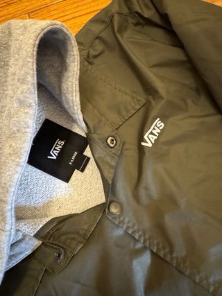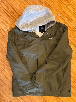 Giacca Vans con cappuccio, ideale per la mezza stagione. - Colore verde militare. - Logo Vans bianco sul petto. - Chiusura con bottoni a pressione. - Cappuccio grigio in felpa.