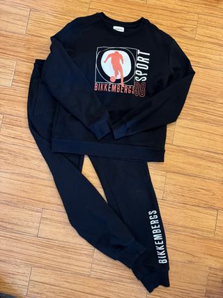Completo tuta sportiva Bikkembergs per ragazzo. - Felpa girocollo nera con stampa frontale. - Pantaloni jogger neri con logo laterale. - Design moderno e confortevole.