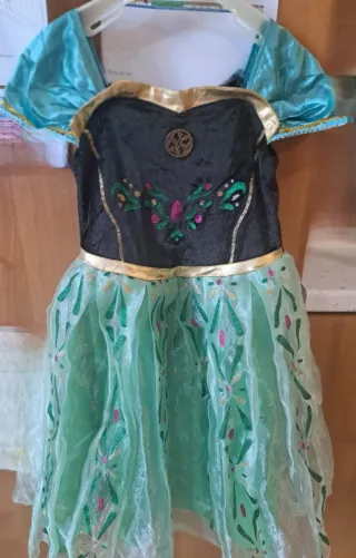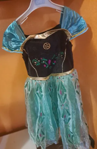 Vestito da principessa per bambina, ispirato a Frozen. - Colore blu e nero. - Dettagli glitterati. - Maniche a sbuffo. - Orlo con decorazioni floreali. È strappato sulla gonna come visibile in foto facilmente sistemabile