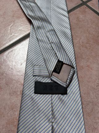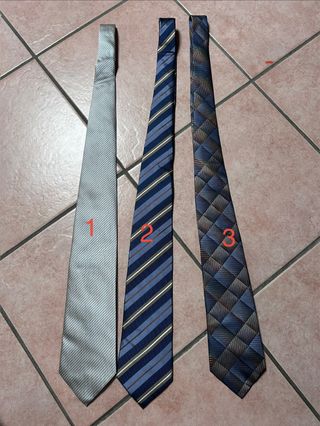 Set di tre cravatte in seta, perfette per completare un look elegante. - Cravatta grigia a righe sottili. - Cravatta blu a righe con dettagli marroni e bianche. - Cravatta con fantasia a rombi nei toni del blu e del grigio. Tutte e 3 le cravatte sono in seta, usate ciascuna una volta. Marchio “SET” - “Conbipel” - “Basile”. Vendibili singolarmente a 5€ ciascuna specificando il numero indicato nella prima foto