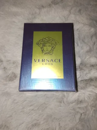 Profumo Versace Eros, confezione blu e oro. - Fragranza maschile. - Design elegante.