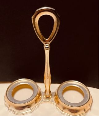 Questo set sale e pepe WMF proviene da una tavola di famiglia a Trieste, città con una lunga tradizione legata ai caffè storici europei. Qui l’arte del convivio è sempre stata un gesto raffinato: basti pensare all’Antico Caffè San Marco, tuttora esistente, luogo simbolo di incontri culturali sin dall’inizio del ’900. La doratura originale è brillante e calda; sono presenti normali segni del tempo nella parte alta, che ne confermano l’autenticità d’epoca. Conservato con cura. Marca: WMF, marchio struzzo nel cerchio Altezza totale 10 cm, singoli 6 cm Diametro base 3,4 cm Larghezza 11 cm – Profondità 5 cm Peso complessivo 180 gr