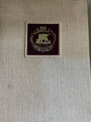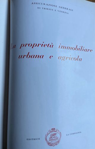 Volume celebrativo delle Assicurazioni Generali, stampato nel 1963. Copertina in tela con Leone di San Marco. Ricostruisce la nascita della Compagnia a Trieste nel 1831, l’espansione nel Mediterraneo e oltremare (con sedi a Bombay, Colombo, Singapore, Zanzibar, Curaçao, Buenos Aires) e la rete immobiliare in Italia e all’estero. La parte finale documenta il ruolo delle Generali nella ricostruzione economica dell’Italia nel dopoguerra e nel contesto della nascente Comunità Europea. Presente una sezione introduttiva in inglese stampate su carta rosa. Pagine interne perfette; copertina con lieve ingiallimento dovuto al tempo