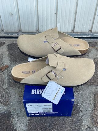 Sandali Birkenstock modello Boston. - Tomaia in morbida pelle scamosciata. - Soletta interna Soft Footbed anatomica. - Fibbia regolabile per una calzata personalizzata. - Suola in sughero e lattice.