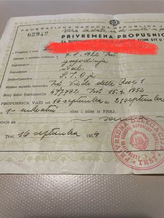 Documento storico originale del 1954, relativo a un permesso provvisorio di viaggio rilasciato a Trieste (Trst) nel periodo del Territorio Libero di Trieste (TNT), sotto amministrazione e occupazione anglo-americana era valido dal 16 al 21 settembre 1954, era rilasciato per un solo ingresso, come attestato dai timbri ufficiali jugoslavi (Sežana). una testimonianza diretta della mobilità controllata al confine orientale nel secondo dopoguerra, in un momento storico particolarmente delicato e significativo, a poche settimane dal Memorandum Londra (ottobre 1954). Foto oscurate x privacy 📐 Formato aperto: circa 15 × 22