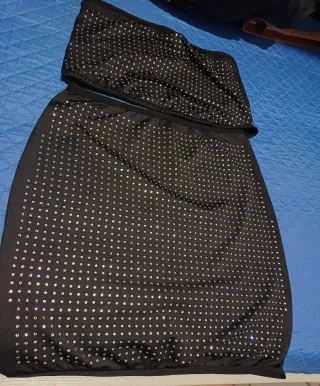 Elegante completo composto da top e minigonna, perfetto per occasioni speciali. - Top senza spalline. - Minigonna aderente. - Decorazione con strass scintillanti su entrambi i capi.