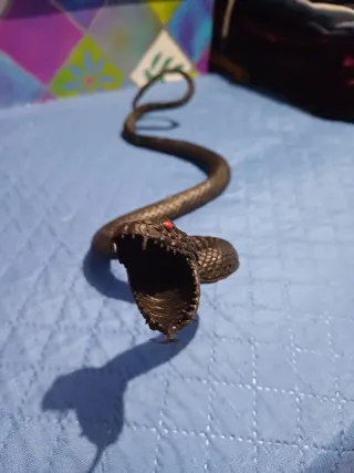 Serpente cobra giocattolo di colore nero, con occhi rossi e lingua biforcuta. - Dettagli realistici delle squame. - Ideale per scherzi o decorazioni.