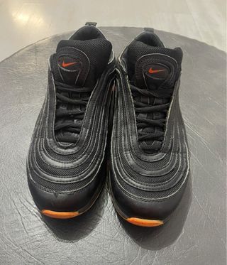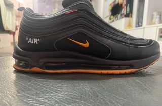 Scarpe Nike Air Max 97/Plus con dettagli OFF WHITE. - Tomaia nera. - Swoosh arancione. - Dettagli arancioni sulla suola.