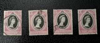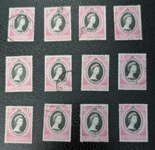 Set di 12 francobolli Coronation della Malaya con l'effigie della Regina Elisabetta II, datati giugno 1953. - Francobolli commemorativi dell'incoronazione. - Valore nominale di 10 cents ciascuno. - Raffigurano la Regina Elisabetta II con la corona. - Ogni francobollo è dedicato a uno stato della Malaya: Malacca, Kedah, Negri Sembilan, Pahang, Perlis, Johore, Kelantan, Singapore, Trengganu, Penang, Selangor, Perak.