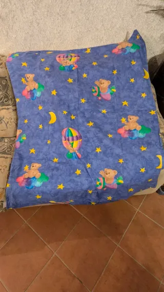 Copripiumino e copri cuscino per bambini con un simpatico disegno di orsetti che volano con palloncini e mongolfiera tra le stelle. Misure Piumino 130 x 60 Federa cuscino 60 x 40 - Fantasia con orsetti e stelle su sfondo blu. - Design colorato e giocoso.