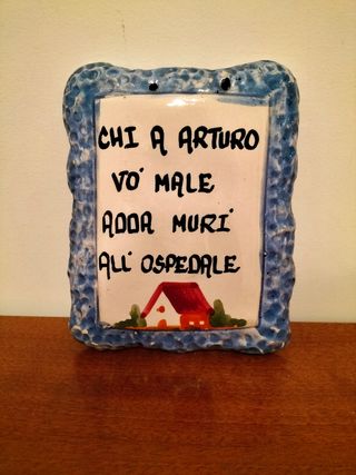 Mattonella da parete vintage in ceramica con scritta proverbiale. Fori in alto per poterlo appendere. Buone condizioni.