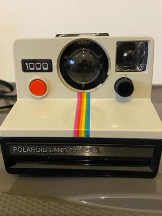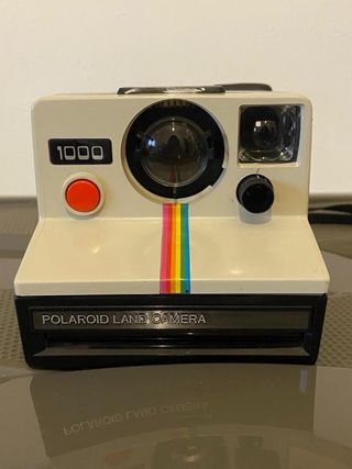 Fotocamera Polaroid Land Camera 1000. Un classico per catturare i tuoi momenti. - Design iconico con strisce arcobaleno. - Pulsante di scatto arancione. - Obiettivo circolare.