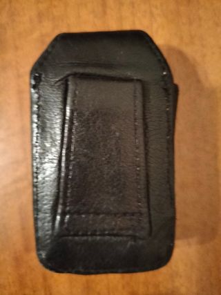 Custodia vintage per cellulari a conchiglia. Colore nero in ecopelle. Sul retro è presente un passante inseribile nella cintura. Discrete condizioni con evidenti segni di usura (vedi foto 4-5).