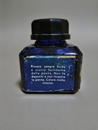 Bottiglietta inchiostro stilografico da collezione. Colore Blu reale, marchio Kore, risalente agli anni 70. Il flacone usato, contiene metà del prodotto. Buone condizioni con qualche segno di usura.