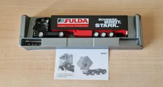 Modellino Herpa Scania R580 con rimorchio Fulda. - Cabina del trattore nera. - Rimorchio nero con scritte FULDA GERMAN HIGH TECHNOLOGY e SCHWARZ. BREIT. STARK.. - Telaio del rimorchio rosso.