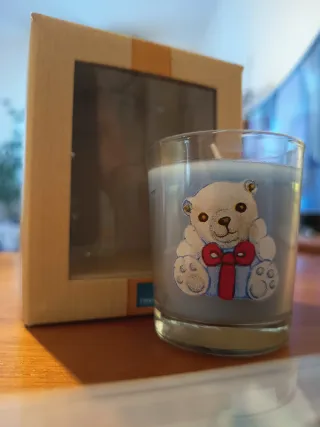 Candela profumata Thun con un simpatico orsetto decorato. Ideale per un regalo o per creare un'atmosfera accogliente. - Decorazione: orsetto con fiocco rosso. - Materiale: vetro e cera.