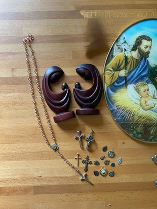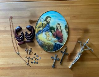 Oggetti sacri, charms, croci, sacra famiglia Ritiro a Novate Milanese oppure Affori Centro Oggetti vari… è possibile acquistare sia singolarmente che in blocco. Valuto proposte. Ci sono statuette in legno, piccoli charms, crocifissi da appendere… #sacrafamiglia #sacrafamilia #crocifisso #croci - Coppia di statuine in legno raffiguranti la Sacra Famiglia. - Piatto decorativo con scena della Natività. - Rosario con grani colorati. - Diverse croci e medagliette. - Crocifisso in metallo.