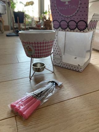 Set per fonduta di cioccolato Sweet Time, mai usato. Perfetto per dolci momenti. - Include 4 forchettine con manici in plastica. - Ciotola in ceramica con decorazione a quadretti rosa e cupcake. - Supporto in metallo.