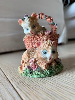 Oggetto decorativo con gatti in un cestino, altezza circa 7 cm, con colori tenui e delicati. Sono perfetti per decorare una mensola o una scrivania. ottime condizioni - Due gattini - Cestino intrecciato - Dettagli floreali