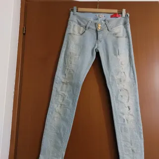Jeans da donna Met, un capo versatile e scintillante. - Tessuto denim con dettagli glitter. - Effetto a pois stampato su parte della superficie. - Chiusura con bottoni dorati.