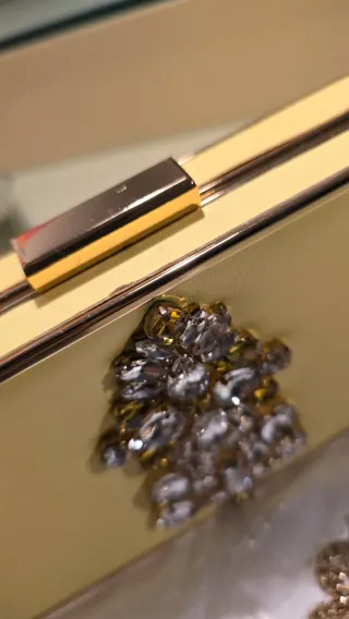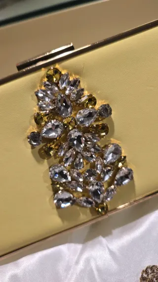 Elegante pochette impreziosita da un ricco ricamo di strass. - Decorazione a forma di fiore con pietre trasparenti e color oro. - Chiusura a scatto metallica. Qualche segni di usura