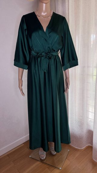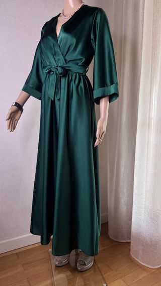 Elegante abito lungo verde smeraldo intenso, indossato solo 2 volte, in condizioni eccellenti. Tessuto satinato morbido e fluido, con una caduta raffinata che slancia la figura e valorizza le forme. Scollatura a V incrociata, maniche 3/4 ed elastico in vita con cintura regolabile per definire la silhouette. Perfetto per matrimoni, cerimonie ed eventi speciali: un capo che fa davvero la sua figura senza spendere una fortuna. Veste M/L. Foto su manichino h 1,70 m. Misure: • Spalle 36 cm • Maniche 43 cm • Larghezza manica 21 cm • Lunghezza totale 130 cm • Cintura 146 cm