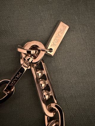 Elegante collana Prada con un design unico tonalità argento. - Maglie a catena alternate a inserti rettangolari. - Dettagli con piccole sfere metalliche sugli inserti. - Chiusura a T.